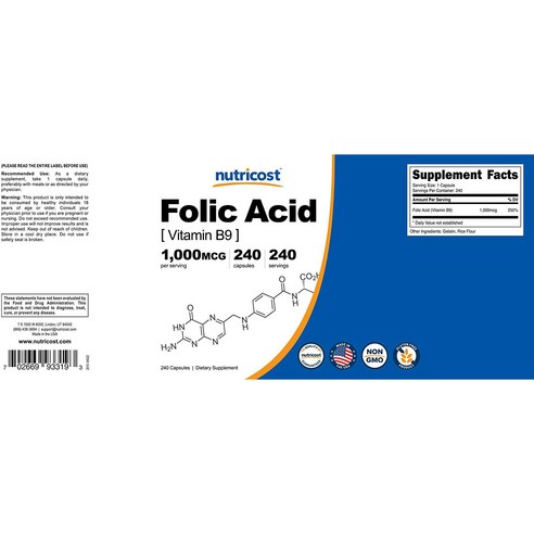 뉴트리코스트 폴릭 애시드 비타민 B9 1000mcg 캡슐, 240개입
